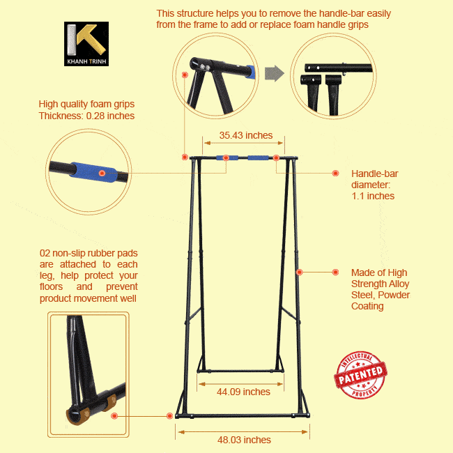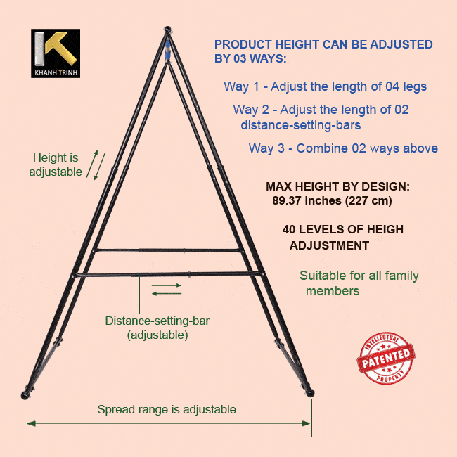 • Min height by design: 46.45 inches (118cm). If you make the spread range wider, the KT pull up bar will be shorter than min height by design